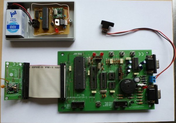 Es hat also lange gedauert, bis die ersten Zeichen am Sender abkamen und mit Hilfe des Print Befehles angezeigt werden konnten. Aber leider waren die Zeichenfolge (32 Stellen von Hex31 bis Hex50) permanent falsch. Allerdings gab es ein auffälliges Muster. Von den 32 Zeichen war immer die 16. Stelle, dann die 8. Stelle, die 4. Stelle, die 2. Stelle und schließlich die erste richtig (gesehen von msb absteigend auf lsb). Daraus schloß ich, das es sich entweder um einen Programmfehler oder um ein Hardwarefehler handeln mußte. Durch Zufall habe ich das Flachbandkabel, dass das Evaluation Board mit der Adapterplatine verbindet, im laufenden Betrieb geknickt - und siehe da - die Zeichenkette war auf einmal richtig! Um es kurz zu machen, ich habe das Kabel drastisch gekürzt (von circa 10cm auf 3 cm). Als nächstes habe ich das Evaluationboard durch einen neuen Empfänger ersetzt. Dieser ist auf Basis eines Atmega 8 und einer LDC Anzeige (2 x8) aufgebaut.